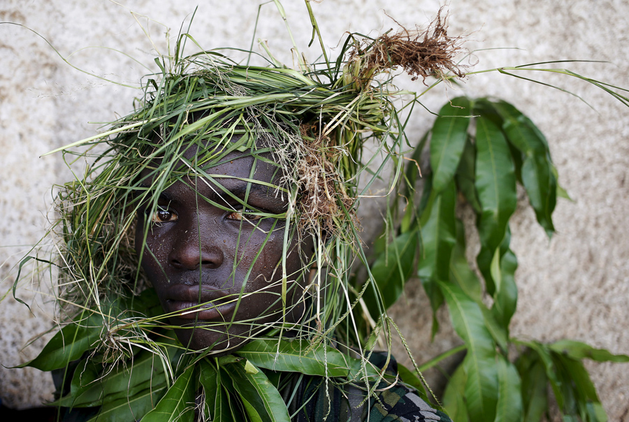 A protester wears grass around his face to obscure his identity during a protest against President Pierre Nkurunziza's decision to run for a third term, in Bujumbura, Burundi, on May 11. 2015.Goran Tomasevic / Reuters