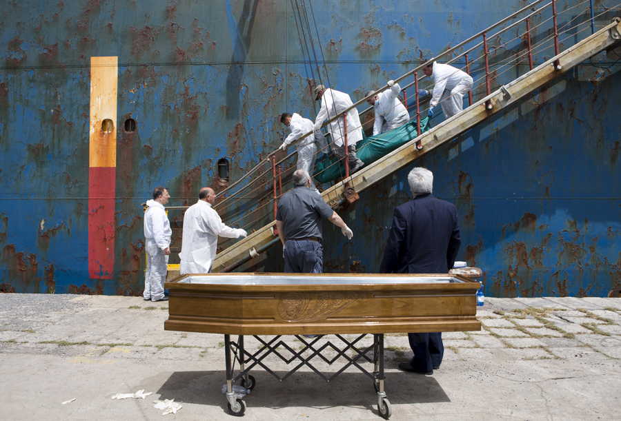 People carry the body of a dead migrant from a merchant ship as they arrive in the Sicilian harbor in Catania, Italy, on May 5, 2015. Local Save the Children spokeswoman Giovanna Di Benedetto said around forty migrants died in the Mediterranean that day, according to survivors of the journey who arrived on the southern Italian island of Sicily.Antonio Parrinello / Reuters