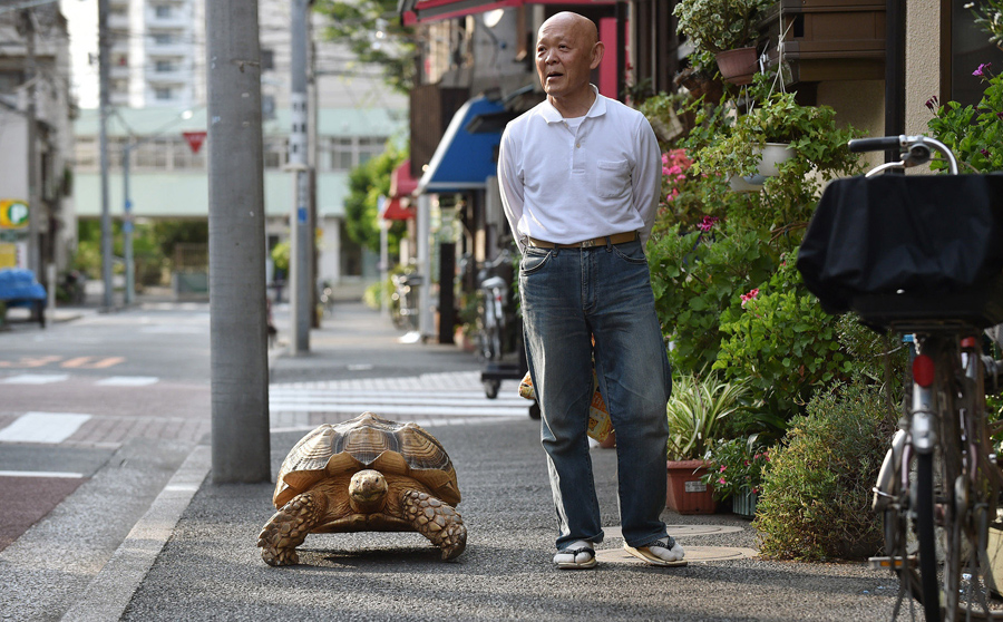 Bon-chan, a 19-year-old male African spurred tortoise weighing about 70 kilograms (154 pounds), walks with his owner Hisao Mitani on a street in the town of Tsukishima in Tokyo, on June 10, 2015. Bon-chan loves fruit and vegetables and is often offered carrot and cabbage pieces by cheering neighbors when he is out.Kazuhiro Nogi / AFP / Getty