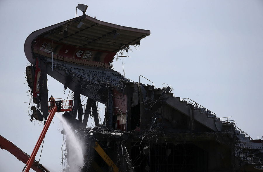 A worker sprays water as a section of Candlestick Park is demolished on June 9, 2015, in San Francisco, California. The demolition of Candlestick Park, the former home of the San Francisco Giants and San Francisco 49ers, was in its final stages with approximately 75 percent of of the structure reduced to rubble. A development with a mall and housing is planned for the site.Justin Sullivan / Getty