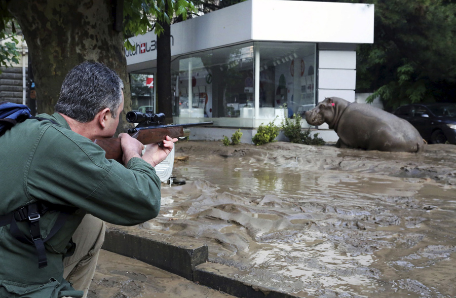 A man shoots a tranquilizer dart to put a hippopotamus to sleep in a flooded street in Tbilisi, Georgia, on June 14, 2015. At least five people died and several were missing as a result of heavy rainfall and floods in the Georgian capital Tbilisi, Georgian news agencies reported. Animals from the city's zoo including tigers, lions, bears, and wolves escaped from cages damaged by the rainfall.Beso Gulashvili / Reuters