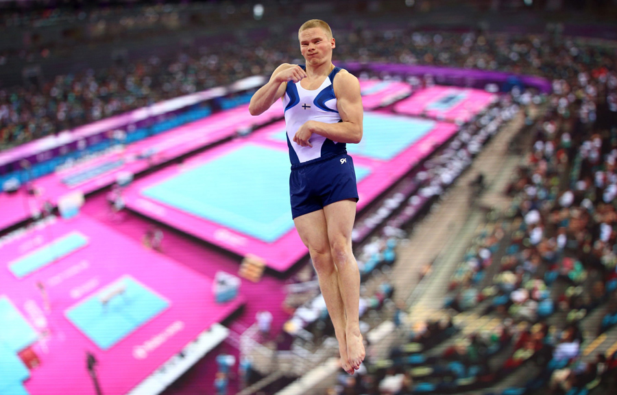 Tomi Tuuha of Finland competes on the vault in front of a large video screen during the Men's Artistic Gymnastics Team and All Around qualification. The photograph was taken on day three of the Baku 2015 European Games at the National Gymnastics Arena on June 15, 2015, in Baku, Azerbaijan.Paul Gilham / Getty for BEGOC