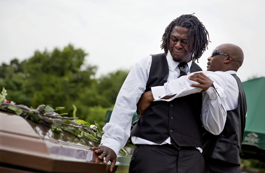 Brandon Risher, left, is pulled away by a friend as he cries over the casket of his grandmother, Ethel Lance, following her burial service on June 25, 2015, in Charleston, South Carolina. Lance was one of the nine people killed in the shooting at Emanuel AME Church in Charleston.David Goldman / AP