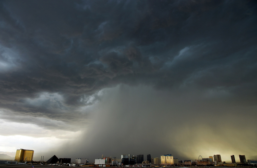 A thunderstorm passes northwest of the Las Vegas Strip on July 6, 2015 in Las Vegas, Nevada. The monsoon storm dropped heavy rain and hail in parts of the valley, causing street flooding and power outages.Ethan Miller / Getty