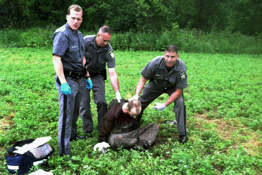Police stand over fugitive David Sweat after he was shot and captured near the Canadian border on Sunday, June 28, 2015, in Constable, New York. Sweat is the second of two convicted murderers who staged a brazen escape from a maximum-security prison in northern New York. His capture came two days after his escape partner, Richard Matt, was shot and killed by authorities.AP