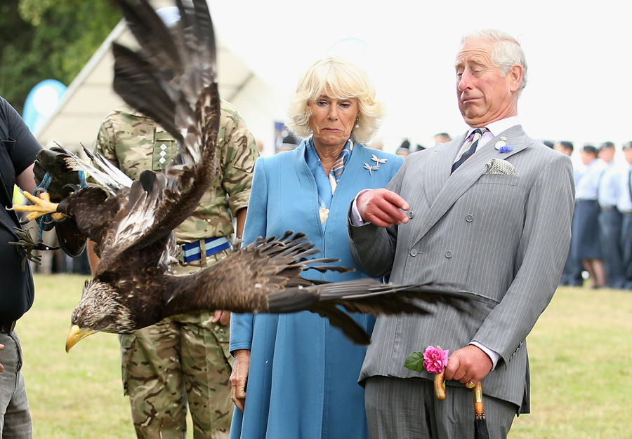 Prince Charles, Prince of Wales and Camilla, Duchess of Cornwall react as Zephyr (a bald eagle), the mascot of the Army Air Corps flaps his wings at the Sandringham Flower Show on July 29, 2015, in King's Lynn, England.Chris Jackson / Getty