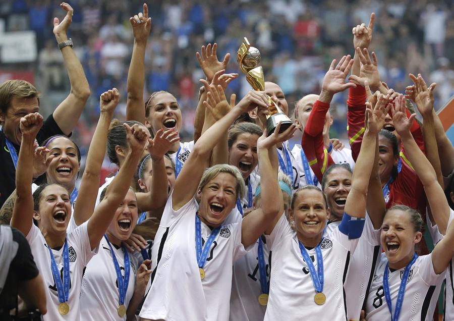 The United States Women's National Team celebrates with the trophy after they beat Japan 5-2 in the FIFA Women's World Cup soccer championship in Vancouver, British Columbia, Canada, on July 5, 2015.Elaine Thompson / AP