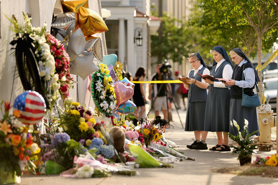 From left, Sisters Margaret Kerry, Mary Thecla, and Kathleen Lang of the Order of the Daughters of St. Paul pray outside the historic Emanuel African Methodist Episcopal Church in Charleston, South Carolina, on June 19, 2015. South Carolina Governor Nikki Haley called for the death penalty for Dylann Storm Roof, age 21, of Lexington, South Carolina, if he is found guilty of murdering nine people during a prayer meeting at the church. Among the dead was the Reverend Clementa Pinckney, the pastor of the church which, according to the National Park Service, is the oldest black congregation in America south of Baltimore.Chip Somodevilla / Getty