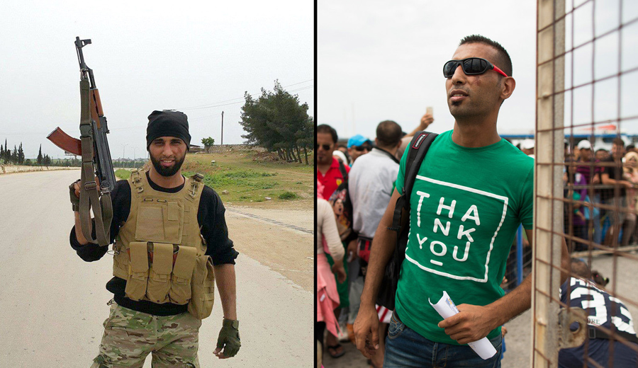 This pair of photos shows Syrian former rebel commander Laith Al Saleh, age 30. On the left, he poses with his assault rifle near his ravaged home city of Aleppo, Syria, in January of 2015. On the right, he waits to board an Athens-bound ferry on the Greek island of Kos on August 15, 2015. Al Saleh is one of the tens of thousands of Syrian men, women, and children who, due to Europe’s asylum policy, risk drowning to be smuggled into Greece by sea on frail, crammed rafts, paying a small fortune for the service. He hopes to gain asylum in the Netherlands, and, this time legally, fly his wife and son over to join him.Alexander Zemlianichenko / AP