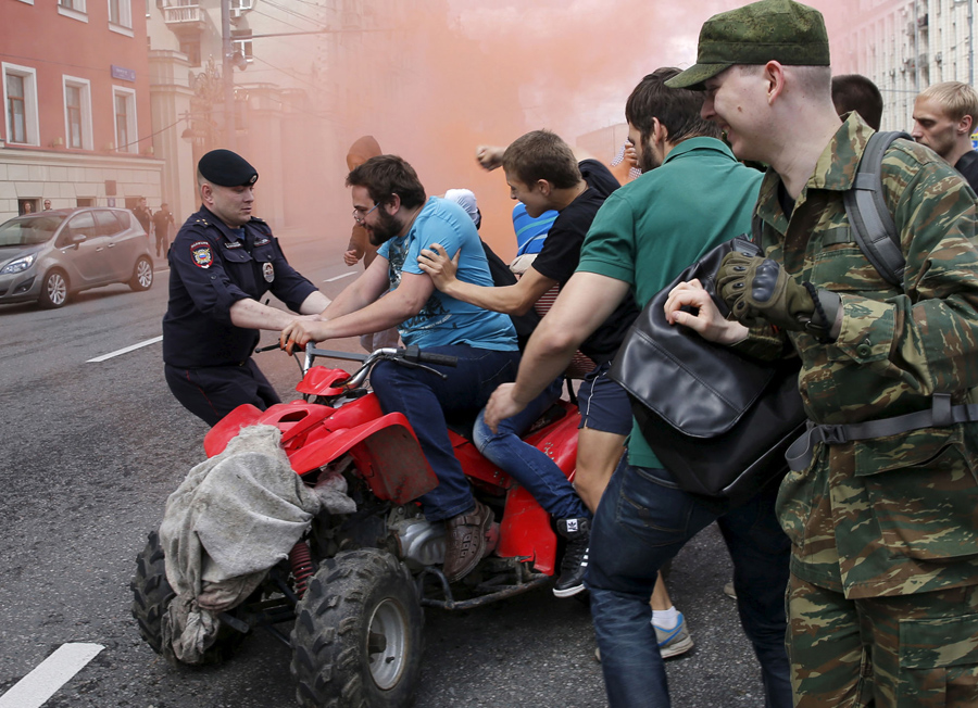 Seals dressed in military uniforms swim during a show marking the 70th anniversary of the end of World War II, at an aquatic park in the Siberian city of Irkutsk, Russia, on May 9, 2015.Evgeny Kozyrev / Reuters