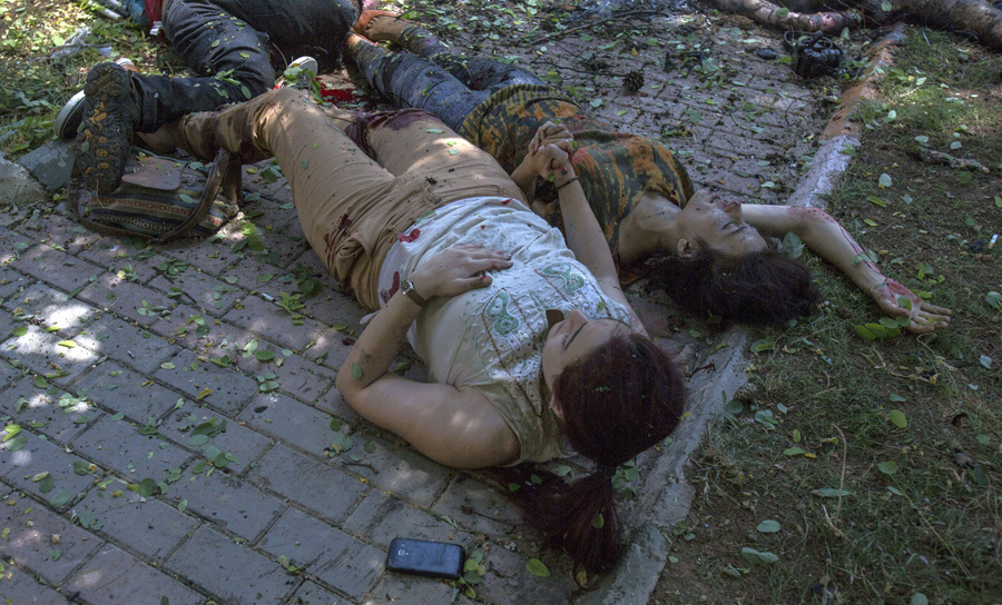 A wounded woman, left, holds the hand of another woman who is about to die just after an explosion rocked the Turkish city of Suruc, near the Syrian border on July 20, 2015, killing 28 people and wounding nearly 100 others in what Turkish authorities said appeared to be an Islamic State-inspired suicide bombing. The mid-day explosion took place at a cultural center in Suruc as a political group, the Federation of Socialist Youths, was wrapping up a news conference on plans to rebuild the Syrian city of Kobani, a witness said.Zeki Yavuzak / AP