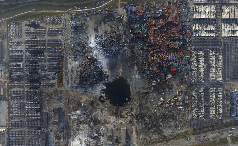 An aerial picture of the site of a series of massive explosions at the Binhai new district, Tianjin, China, on August 16, 2015. The explosions the previous week in the world's 10th-busiest port in China's industrial northeast forced the evacuation of thousands of people after toxic chemicals were detected in the air. More than 170 people were killed, and nearly 800 people were injured. The blasts devastated a large industrial site and nearby residential areas.Reuters