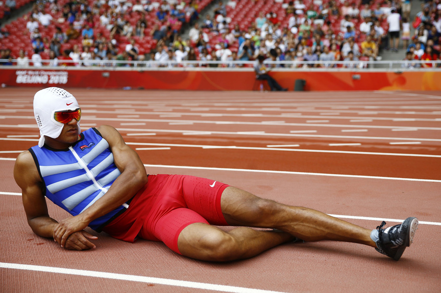 Ashton Eaton of the U.S. rests with a cooling face mask as he competes in the pole vault event of the men's decathlon, during the 15th IAAF World Championships at the National Stadium in Beijing, China, on August 29, 2015.Kai Pfaffenbach / Reuters