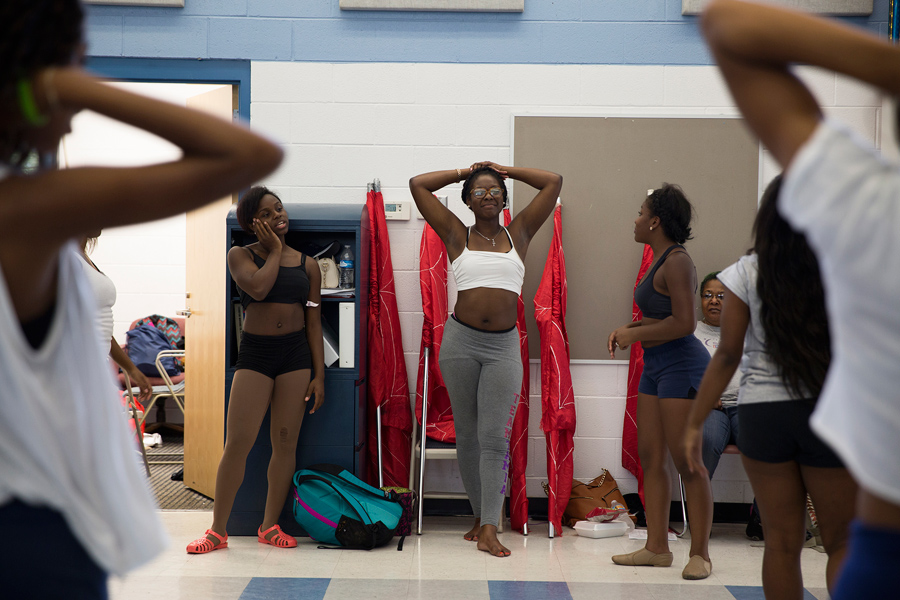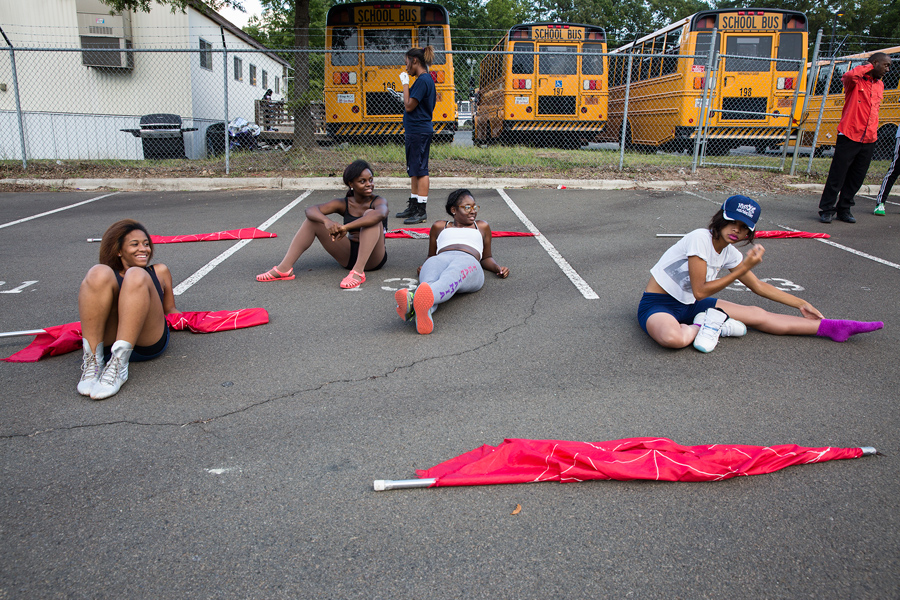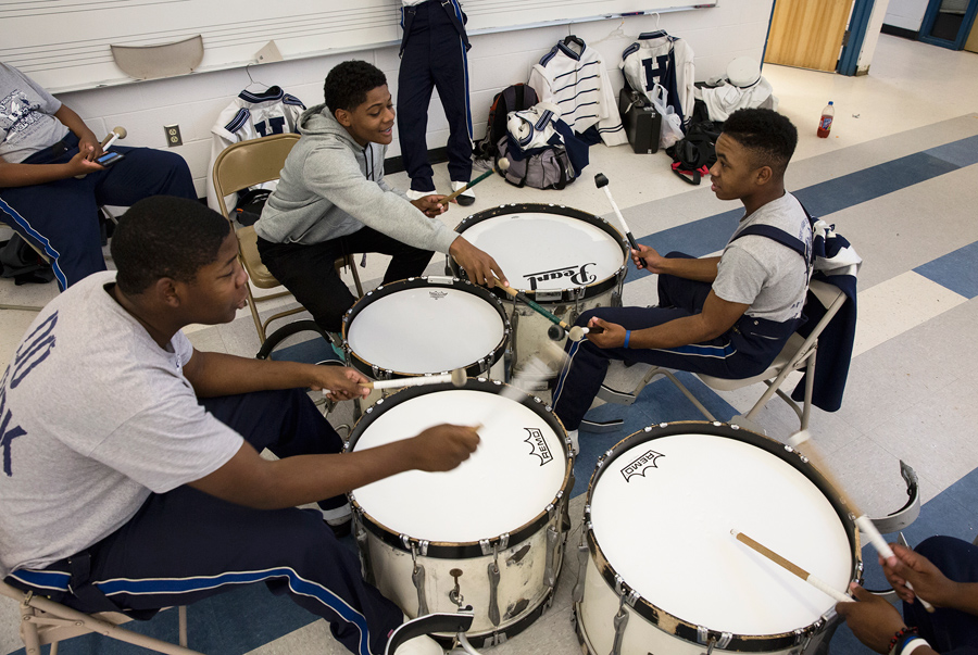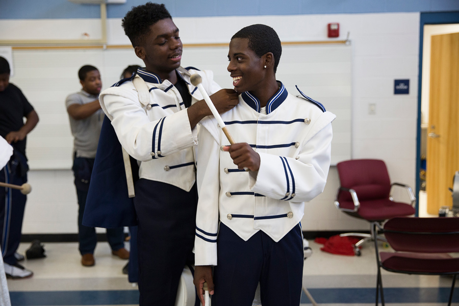Bryanna Williams, right, and Ashton Farrar, both juniors, share a moment of closeness. Farrar, a snare drummer, has been playing the drums since he was 5-years-old. “It helps me clear my head,” he said. Farrar wants to study biology when he graduates. Williams, one of the auxiliary dancers, wants to study art therapy and pursue a career in entertainment.