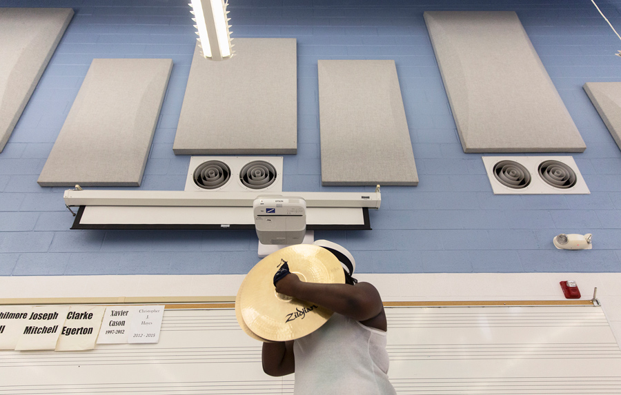 Ryshean Gulley, left, Janssen Slade, middle, and Dorian Terry, right, play the bass drum before practice begins. Gulley, a senior, has been playing the drums since he was 12-years-old. He is the section leader for bass drum and wants to continue playing in college while studying aerospace engineering. Slade, a senior, plays the snare drum and wants to pursue broadcast journalism in college while continuing to play baseball, and Terry, a junior and snare drummer, wants to play baseball professionally.