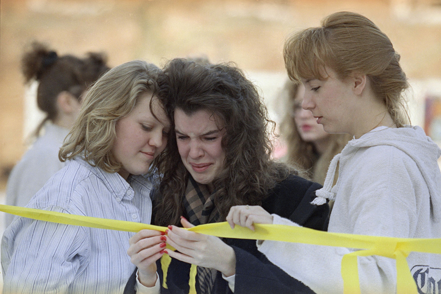 Cazenovia College students Amy Acker, of Rochester, left, and Sandra Ceplo, of Afton, comfort a tearful Megan Murray, of Mechanicville, center, while placing yellow bows and ribbons on campus in Cazenovia, New York, on January 15, 1991. Scores of students, many with loved ones serving in the Persian Gulf decorated buildings, trees and bushes with ribbon in honor and support of U.S. troops.Michael J. Okoniewski / AP