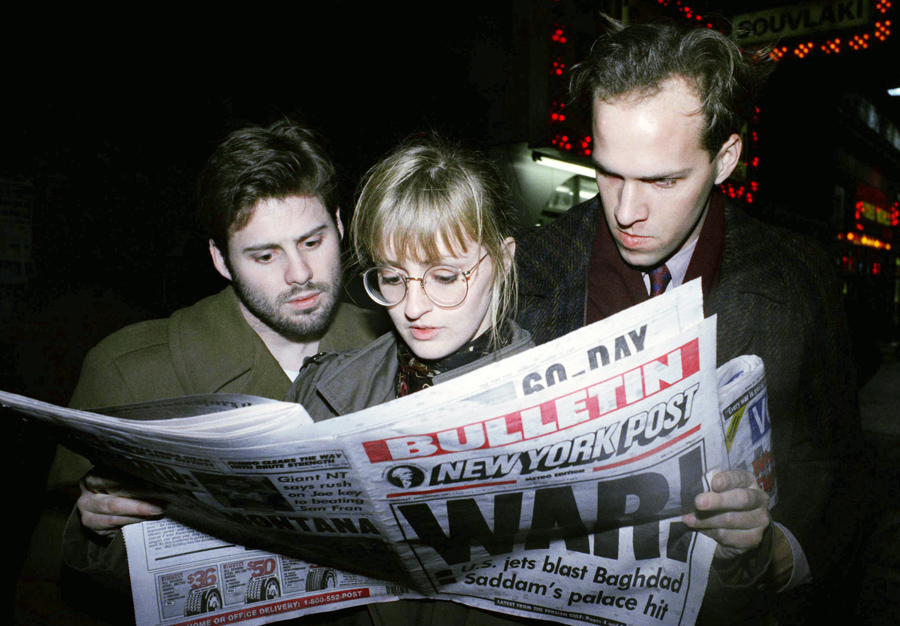 Rebecca Spice, a tourist from Milwaukee, Wisconsin, is flanked by Joel Kopischke, left, and Robert Simonson, both of New York, as they read a bulletin edition of the New York Post reporting the outbreak of hostilities in the Persian Gulf in New York’s Times Square on January 17, 1991.Michael Albans / AP