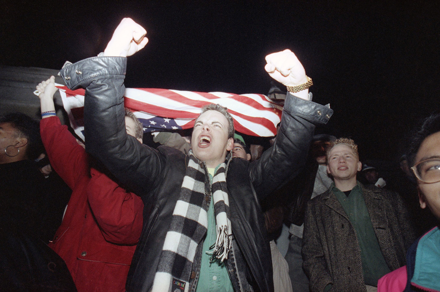 Boston University freshman Christopher Cooley raises his fists before a U.S. flag in support of news that the U.S. forces had started military actions against Iraq, during a demonstration at the Statehouse in Boston on January 17, 1991.Gayle Shomer / AP