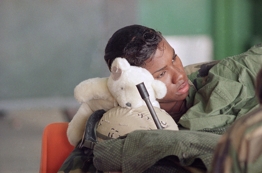 Sergeant Rachel Forehand, from Brooklyn, New York, rests her head on a stuffed bear as the U.N. deadline for Iraq to withdraw from Kuwait passed in Saudi Arabia on January 16, 1991. Forehand is a nurse with 28th Combat Support Hospital, stationed at Fort Bragg. N.C. She and other members of her unit were waiting for a plane carry them to a forward base.Bob Daugherty / AP