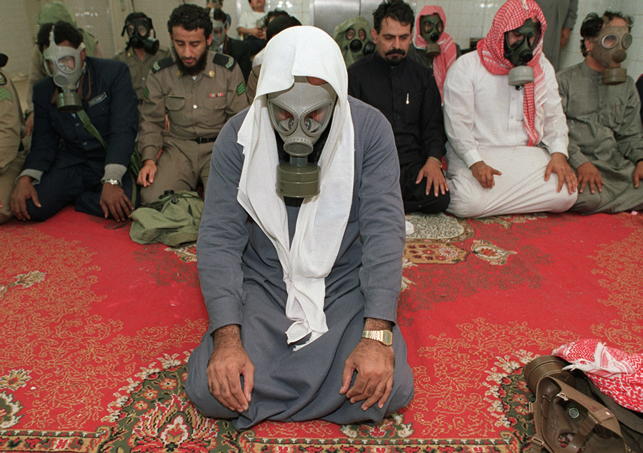 Soldiers, hotel workers and others, some wearing gas masks, kneel for morning prayers on January 18, 1991, in a basement used as a bomb shelter at a hotel in eastern Saudi Arabia. A Scud missile fired by Iraq had reportedly been intercepted and destroyed by a Patriot missile earlier in the day.J. Scott Applewhite / AP