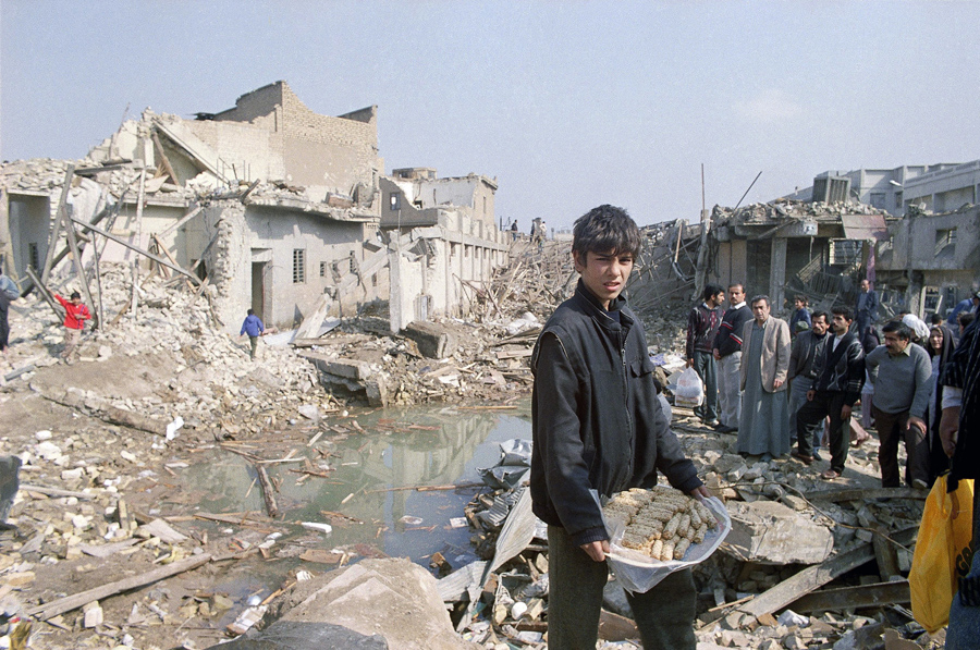 A young Iraqi boy carried a plate of sausage in the ruins of houses in an area west of Al-Ahrar Bridge, Baghdad, on February 20, 1991, after a recent allied bombing raid.John Rice / AP