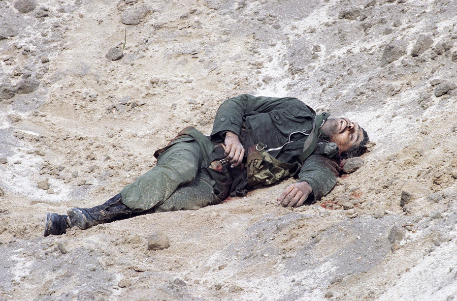 The body of an Iraqi soldier lies in a sandy ditch on the outskirts of Kuwait City on February 27, 1991, after being killed as coalition forces moved in to liberate the city.Laurent Rebours / AP