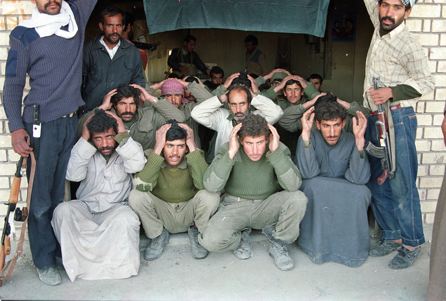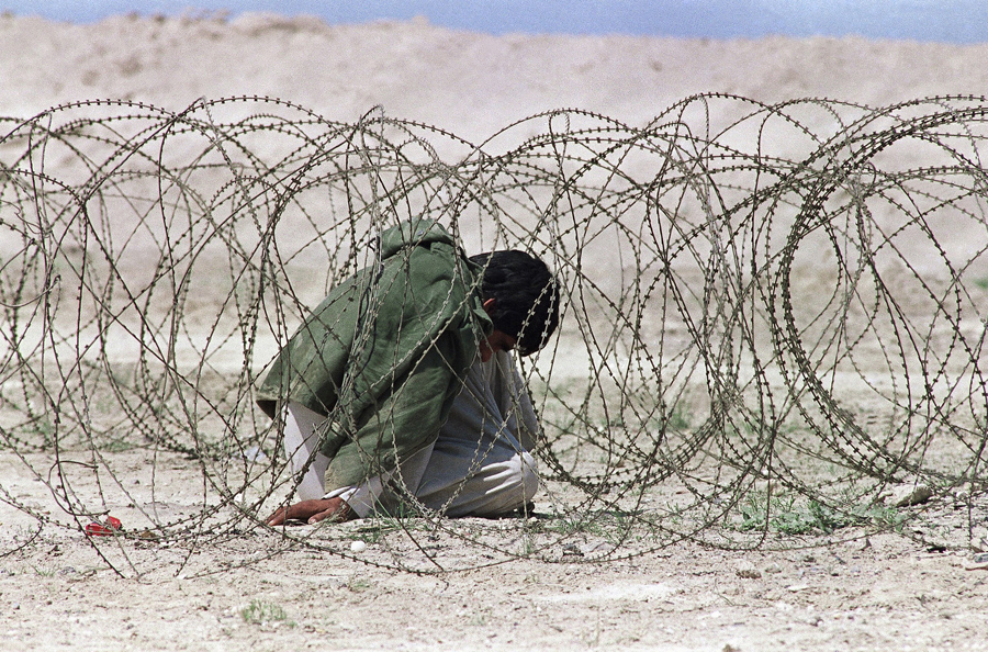 An Iraqi sits huddled in a barbed wire holding area at a U.S. checkpoint some 25 miles south of Basra, on March 28, 1991 in Iraq, after he and four others were arrested by U.S. soldiers for allegedly robbing and murdering refugees. Four members of the five-member gang were armed and all were carrying a “considerable amount of money” according to U.S. officials.Peter Dejong / AP