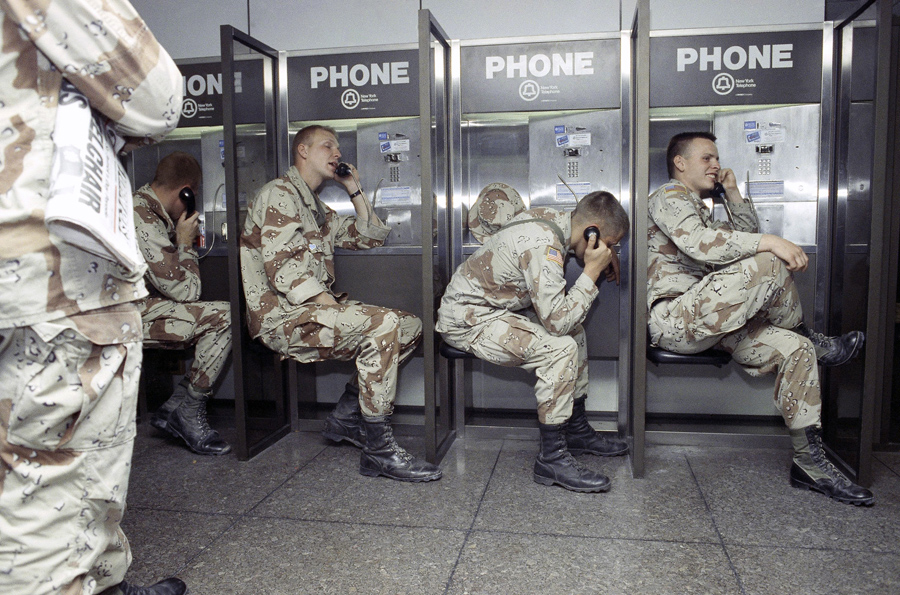 U.S. soldiers returning from the Gulf make telephone calls at New York's Kennedy Airport on March 8, 1991. The soldiers, tired after their 14-hour flight via Rome, flashed “victory” signs as they stepped off planes to the sound of cheering airline employees, and an Army band that played “God Bless America.”Bebeto Matthews / AP