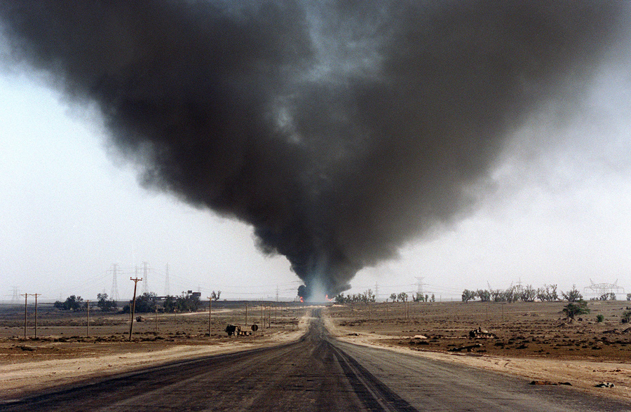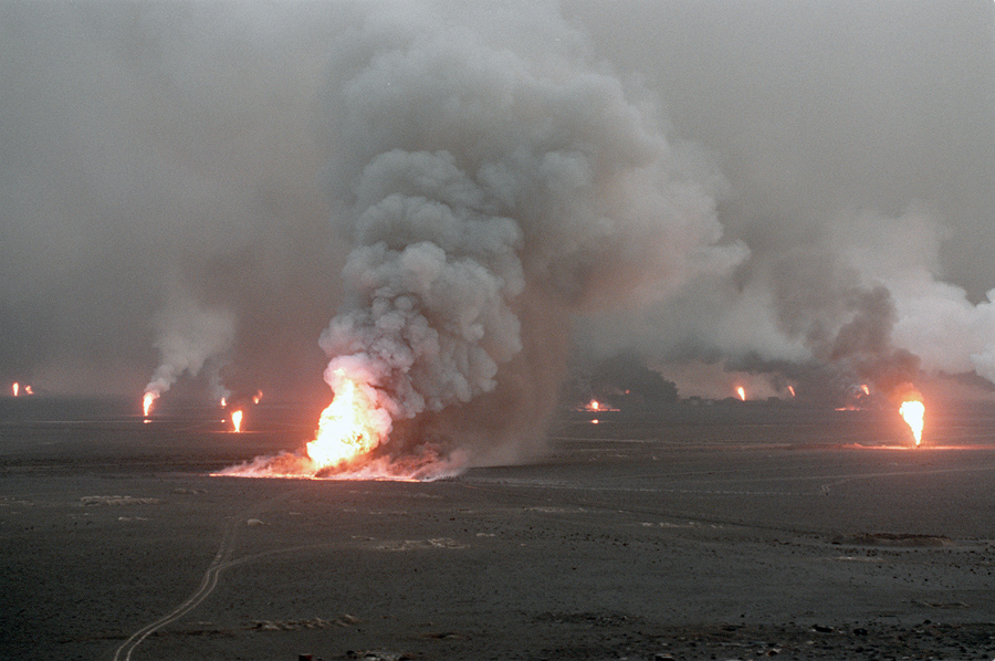 Several blown-out wells damaged by retreating Iraqi soldiers in Al-Ahmadi oil-field burn on April 1, 1991, in southern Kuwait. Iraqi troops retreating after a seven-month occupation, smashed and torched 727 wells, badly polluting the atmosphere and creating crude oil lakes. In addition, up to eight billion barrels of oil were split into the sea by Iraqi forces damaging marine life and coastal areas up to 400 kilometers (250 miles) away.Pascal Guyot / AFP / Getty