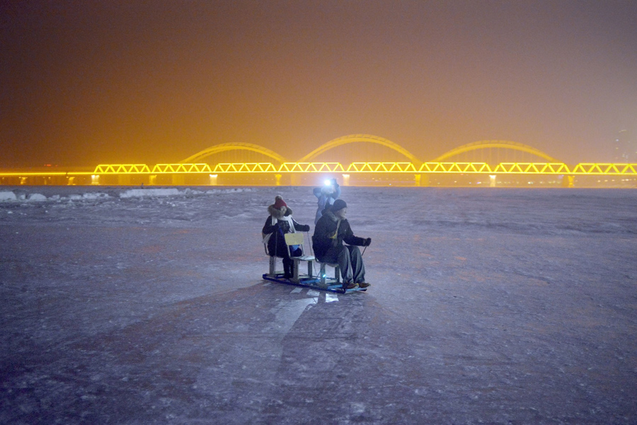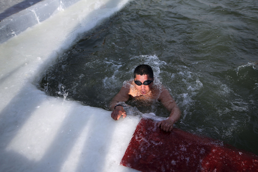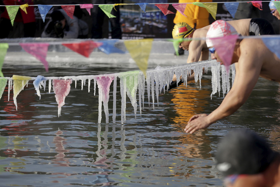 Swimmers dive into a pool carved from thick ice covering the Songhua River during the Harbin Ice Swimming Competition on January 5, 2016. The swimming competition was held on the official launch day of the Harbin International Ice and Snow Sculpture Festival.Aly Song / Reuters