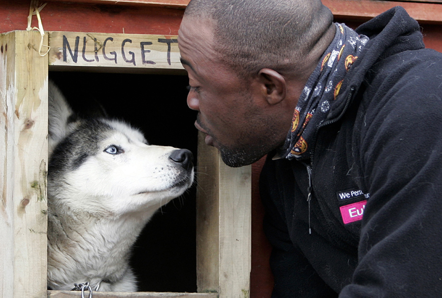 Jamaican Devon Anderson looks at one of his huskies in Aviemore, Scotland, on January 17, 2006. Devon was in Scotland to take part in the Aviemore Sled Dog Race. It was the first time in the event's 22-year history that a Jamaican took part.Reuters