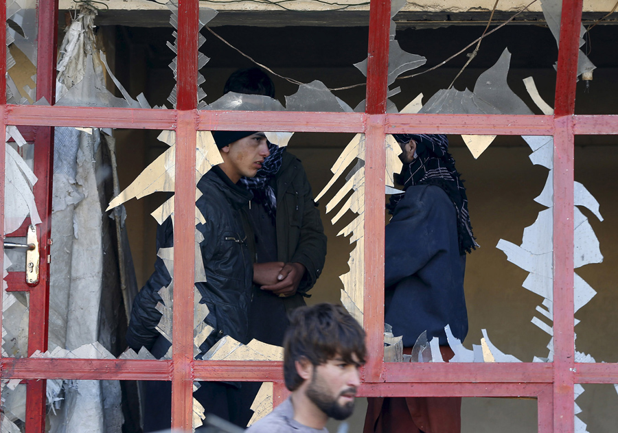 Afghans talks to each others inside their shop at the side of suicide bomb attack in Kabul, Afghanistan, on December 28, 2015. A suicide bomber killed at least one person and wounded 13 in an attack on a road near Kabul airport, officials in the Afghan capital said on Monday, barely two weeks after a major Taliban assault in the city.Omar Sobhani / Reuters