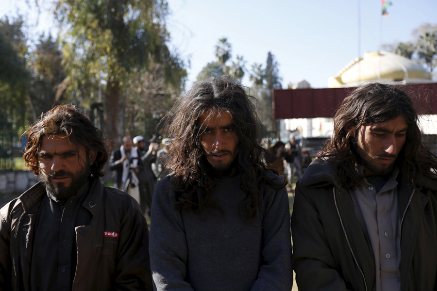 Taliban militants, who were arrested by Afghan border police, stand during a presentation of seized weapons and equipment to the media in Jalalabad on December 29, 2015.Parwiz / Reuters