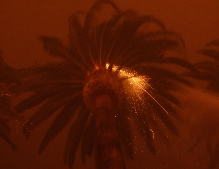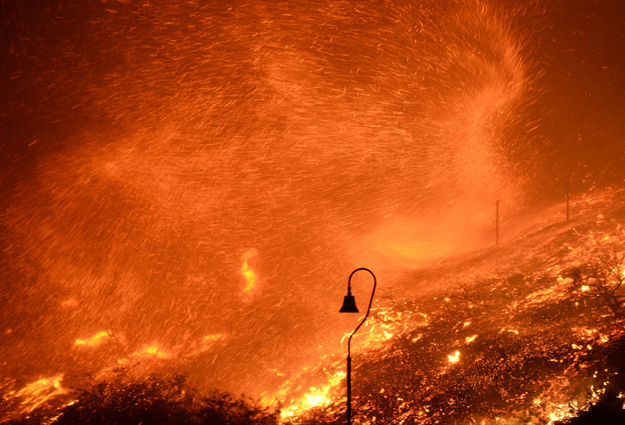 Fire photographer Tod Sudmeier gets hit with flying embers from strong winds at the Solimar brush fire in Ventura County, California, on December 26, 2015. The wildfire burned over 1,000 acres of land, forced the closure of parts of two major highways and led to evacuations on Saturday, fire officials said.Gene Blevins / Reuters