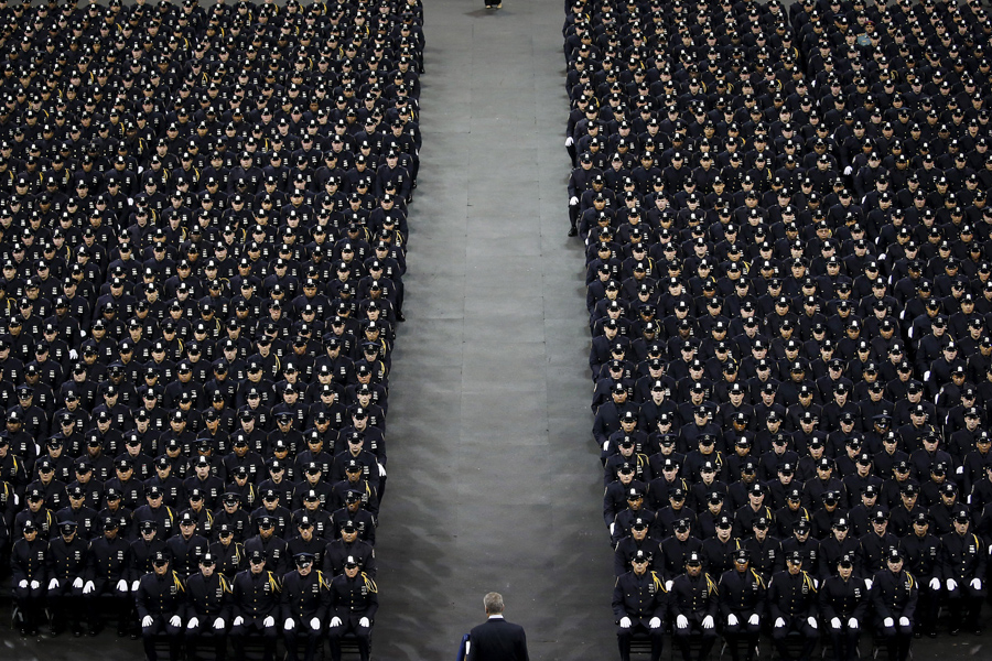 Mayor Bill de Blasio speaks to police officers in New York City as they take part in a graduation ceremony at Madison Square Garden on December 29, 2015. According to de Blasio, 1,123 new officers graduated onto the force.Carlo Allegri / Reuters