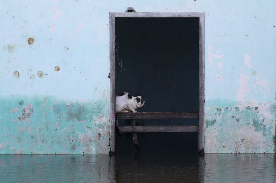 A woman cleans the inside window of her wine bar, as the floodwaters rise outside from the rivers Foss and Ouse, after they burst their banks in York, northern England, on December 28, 2015.Justin Tallis / AFP / Getty