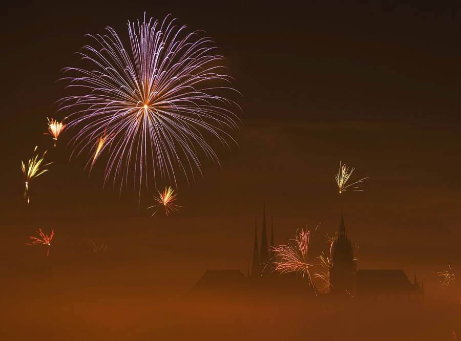 Fireworks light the sky above the medieval Mariendom or St. Mary's Cathedral, right, and St. Severi's Church shortly after midnight during the New Year celebrations in Erfurt, Germany, on January 1, 2016.Jens Meyer / AP