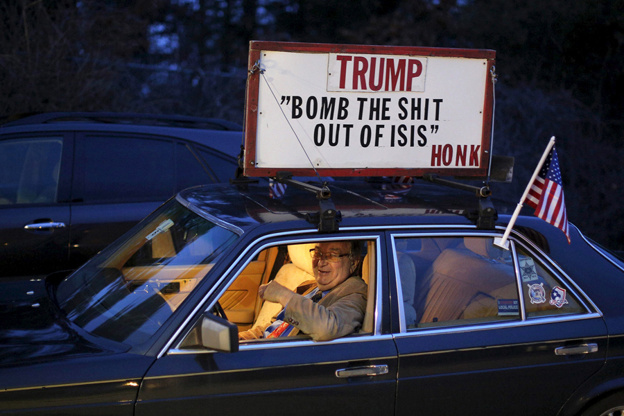 A man sits in a car with a sign on top, outside a campaign rally with U.S. Republican presidential candidate Donald Trump in Nashua, New Hampshire, on December 28, 2015.Brian Snyder / Reuters