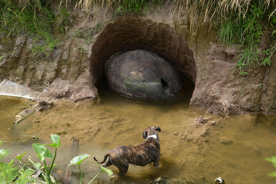 A dog wades in a stream beside the remains of a glyptodont shell found in Carlos Spegazzini, Buenos Aires Province, Argentina, on December 29, 2015. Glyptodonts were massive armored animals, related to modern armadillos, that went extinct during the most recent ice age.Eitan Abramovich / AFP / Getty
