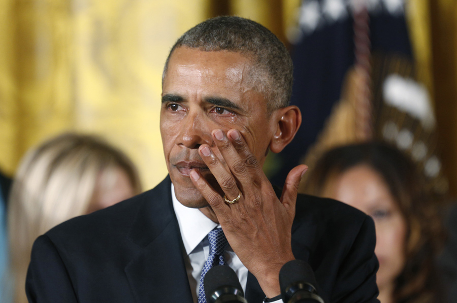 U.S. President Barack Obama wipes away tears while talking about Newtown and other mass shooting during an event held to announce new gun control measures, at the White House in Washington on January 5, 2016.Kevin Lamarque / Reuters