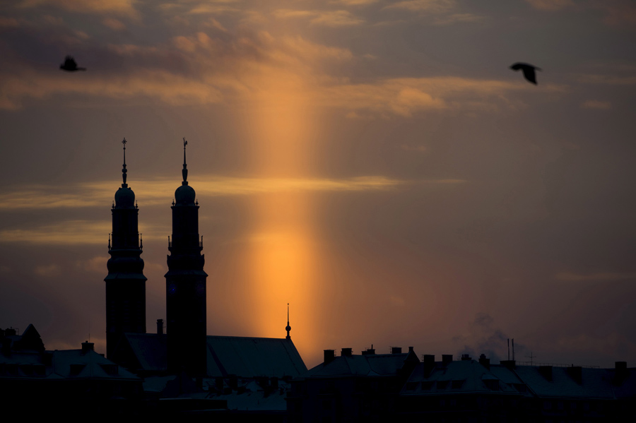 The sun sets against the skyline, throwing a reflection off ice crystals in the air to produce a sun pillar phenomenon in Stockholm, Sweden, on January 7, 2016.TT News Agency / Reuters