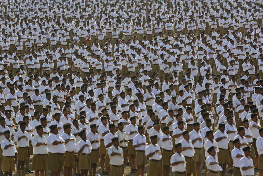 Volunteers of the Hindu nationalist organization Rashtriya Swayamsevak Sangh (RSS) pray as they attend a conclave on the outskirts of Pune, India, on January 3, 2016. Thousands of volunteers attended the gathering which was held to promote the organization and reach out to the society, according to local media reports.Danish Siddiqui / Reuters