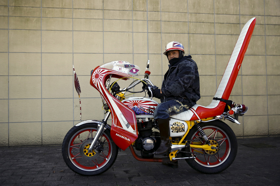 A biker poses on his Bousouzoku motorbike at the Dangouzaka rest stop in Yamanashi, west of Tokyo, Japan, on January 3, 2016. Police halted a group of about two dozen Bousouzoku bikers who paraded their noisy motorcycles during an annual New Year outing in the Mount Fuji region. This Japanese motorcycle subculture dated back in the 1950s and regularly chafes with the police because of their provocative traffic behavior and bike customizing, that is often deemed illegal.Thomas Peter / Reuters