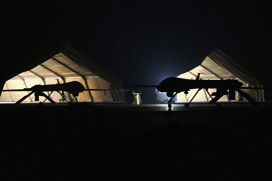 A U.S. Air Force MQ-1B Predator unmanned aerial vehicle (right) returns from a mission to an air base in the Persian Gulf region on January 7, 2016. The U.S. military and coalition forces use the base, located in an undisclosed location, to launch drone airstrikes against ISIS in Iraq and Syria, as well as to transport cargo and and troops supporting Operation Inherent Resolve. The Predators at the base are operated and maintained by the 46th Expeditionary Reconnaissance Squadron, currently attached to the 386th Air Expeditionary Wing.John Moore / Getty