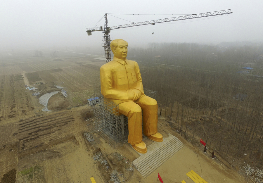 A crane is seen next to a giant statue of Chinese late chairman Mao Zedong under construction near crop fields in a village of Tongxu county, Henan province, China, on January 4, 2016. According to local villagers, several entrepreneurs spent nearly 3 million yuan (460,000 USD) to build the 36.6-meter-high statue covered in golden paint. On Friday, reports emerged that local authorities deemed the structure to be illegal, and ordered it torn down.Reuters