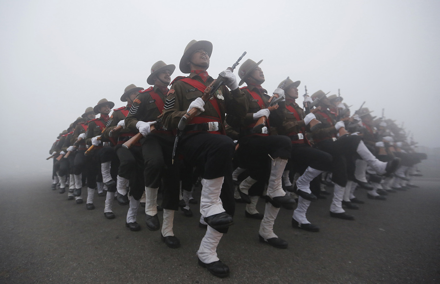 Indian soldiers take part in the rehearsal for the Republic Day parade on a foggy winter morning in New Delhi, India, on January 8, 2016. India will celebrate its annual Republic Day on January 26.Anindito Mukherjee / Reuters