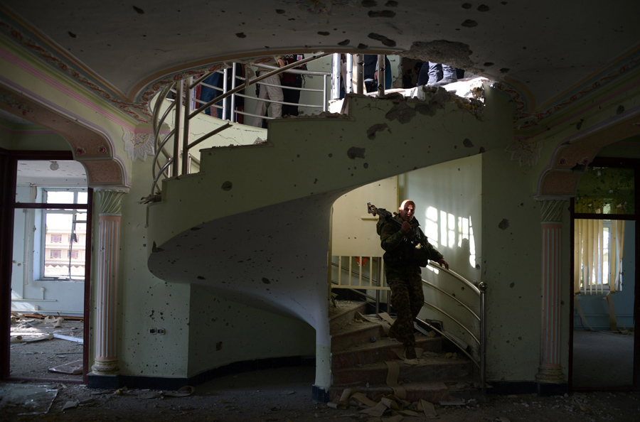 An Afghan security force member walks inside a building used by insurgents to launch an attack on the Indian consulate, in Mazar-i-Sharif on January 5, 2016. A 25-hour gun and bomb siege near the Indian consulate in the Afghan city of Mazar-i-Sharif ended late January 4, after all the attackers were killed, officials said.Farshad Usyan / AFP / Getty