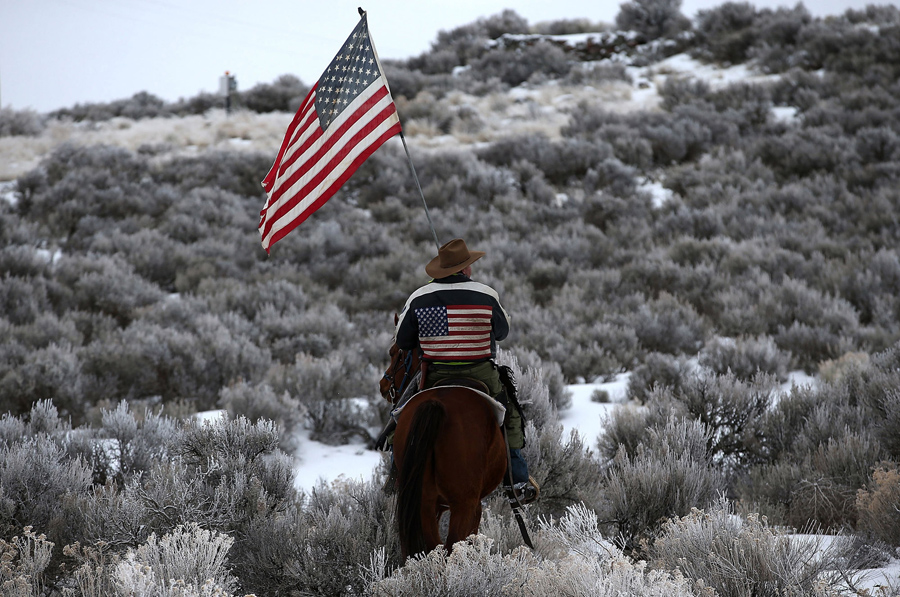 Dwayne Ehmer carries an American flag as he rides his horse on the Malheur National Wildlife Refuge on January 7, 2016, near Burns, Oregon. An armed anti-government militia group continues to occupy the Malheur National Wildlife Headquarters as they protest the jailing of two ranchers for arson.Justin Sullivan / Getty