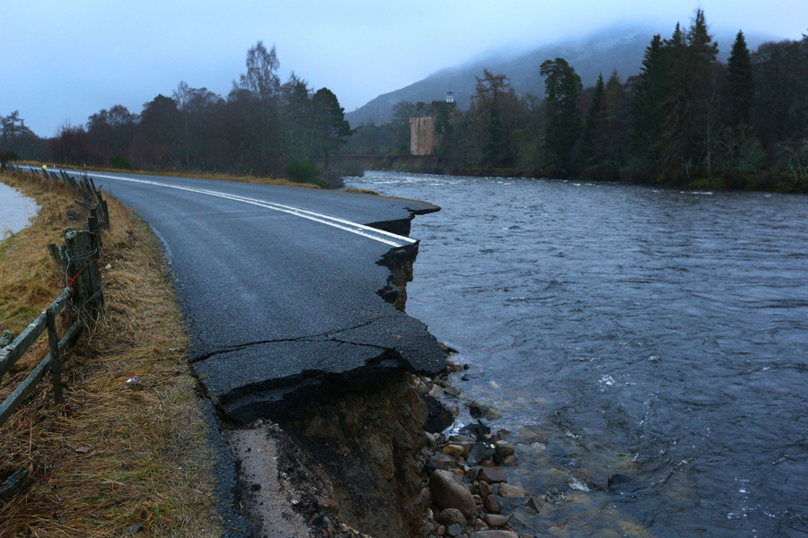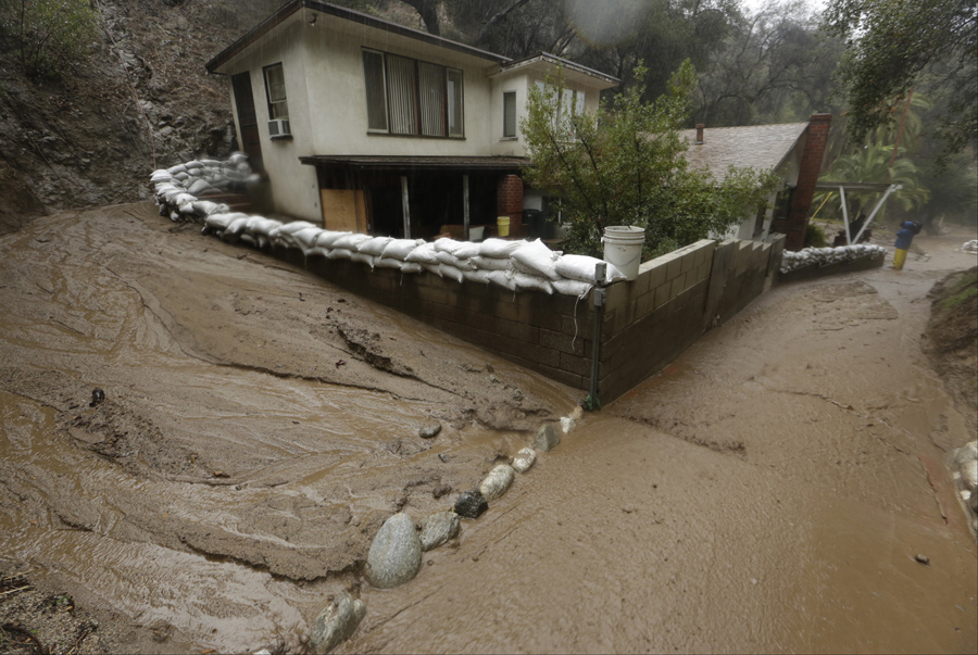 A mud flow skirts a house protected with sandbags in Monrovia, California, on January 6, 2016. A wildfire two years ago stripped away vegetation and loosened soil. The current El Nino system, a natural warming of the central and eastern Pacific Ocean that interacts with the atmosphere and changes weather worldwide, has tied a system in 1997-1998 as the strongest on record.Damian Dovarganes / AP