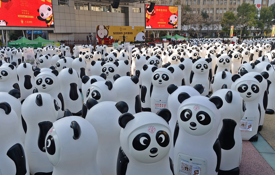 800 panda bins stand at Century Square near Nanjing Road to promote garbage classification on January 8, 2016 in Shanghai, China. The activity was held to promote the panda bins, which are used to collect used clothes for donation or recycling. The bins, introduced as part of a environmental protection campaign in 2012, can be found across the city in Schools and residential communities.ChinaFotoPress / Getty